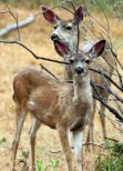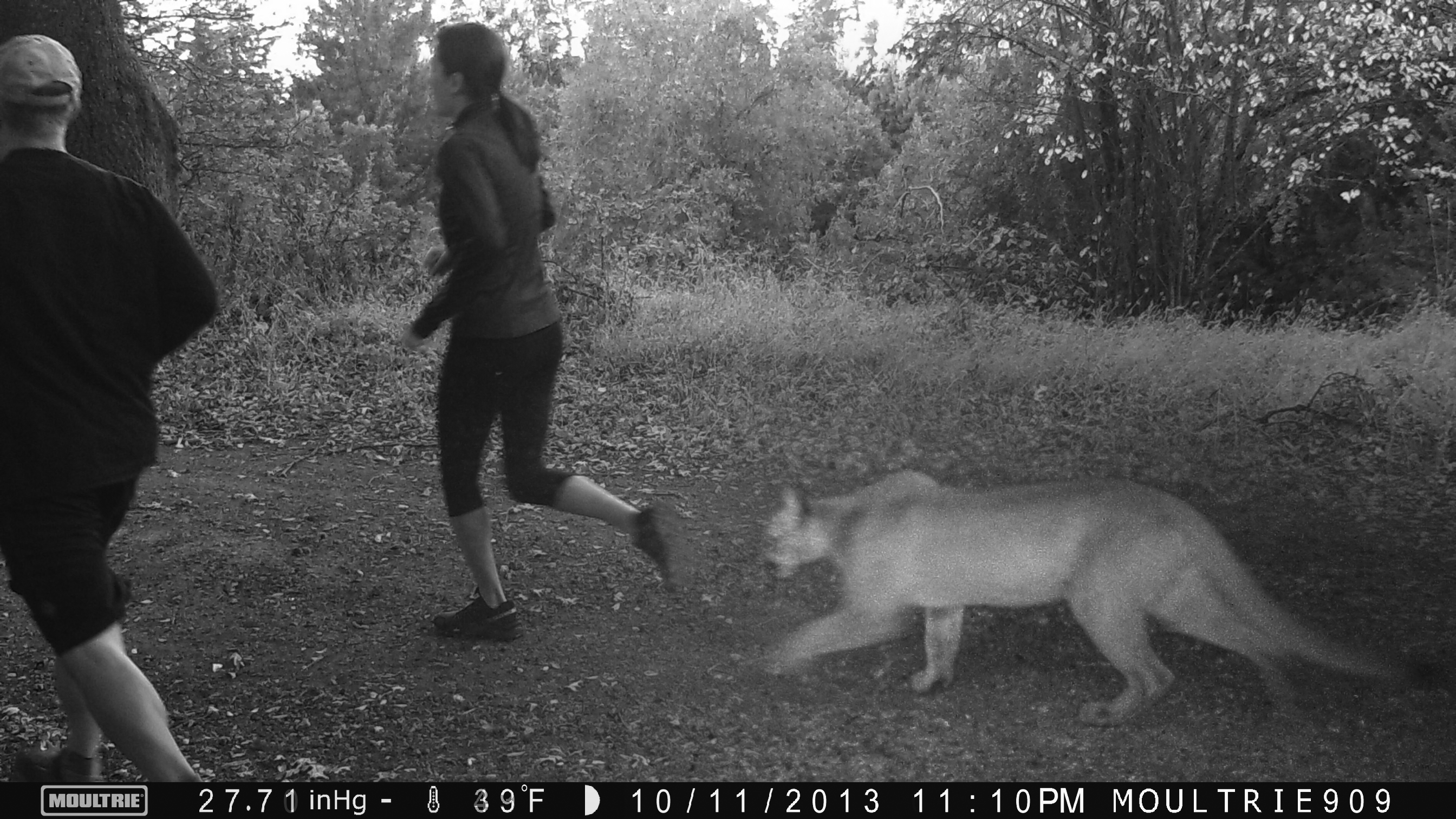 Recently (November of 2013) a pair of mountain lion have been sighted near here; a link to the video is here: Lions.AVI and a composite shot of two pictures taken by the trail camera from the same place of runners during the day, and one of the lions that night gives you a sense of how wonderfully scary it is to be sharing the mountains with these creatures.